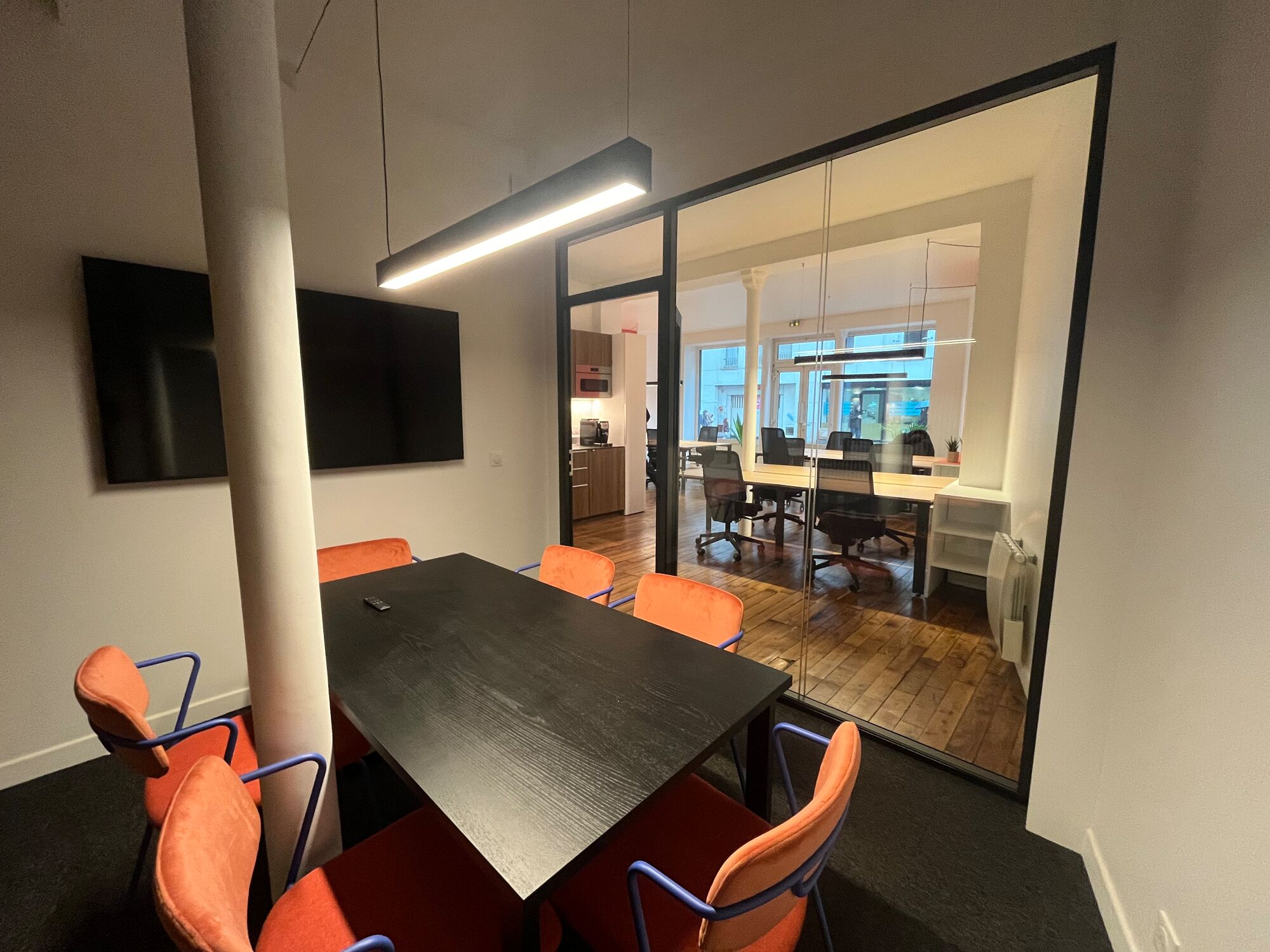 ✅ Salle de réunion insonorisée et équipée avec système de visio conférence (écran plat 65" + caméra)